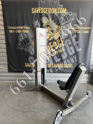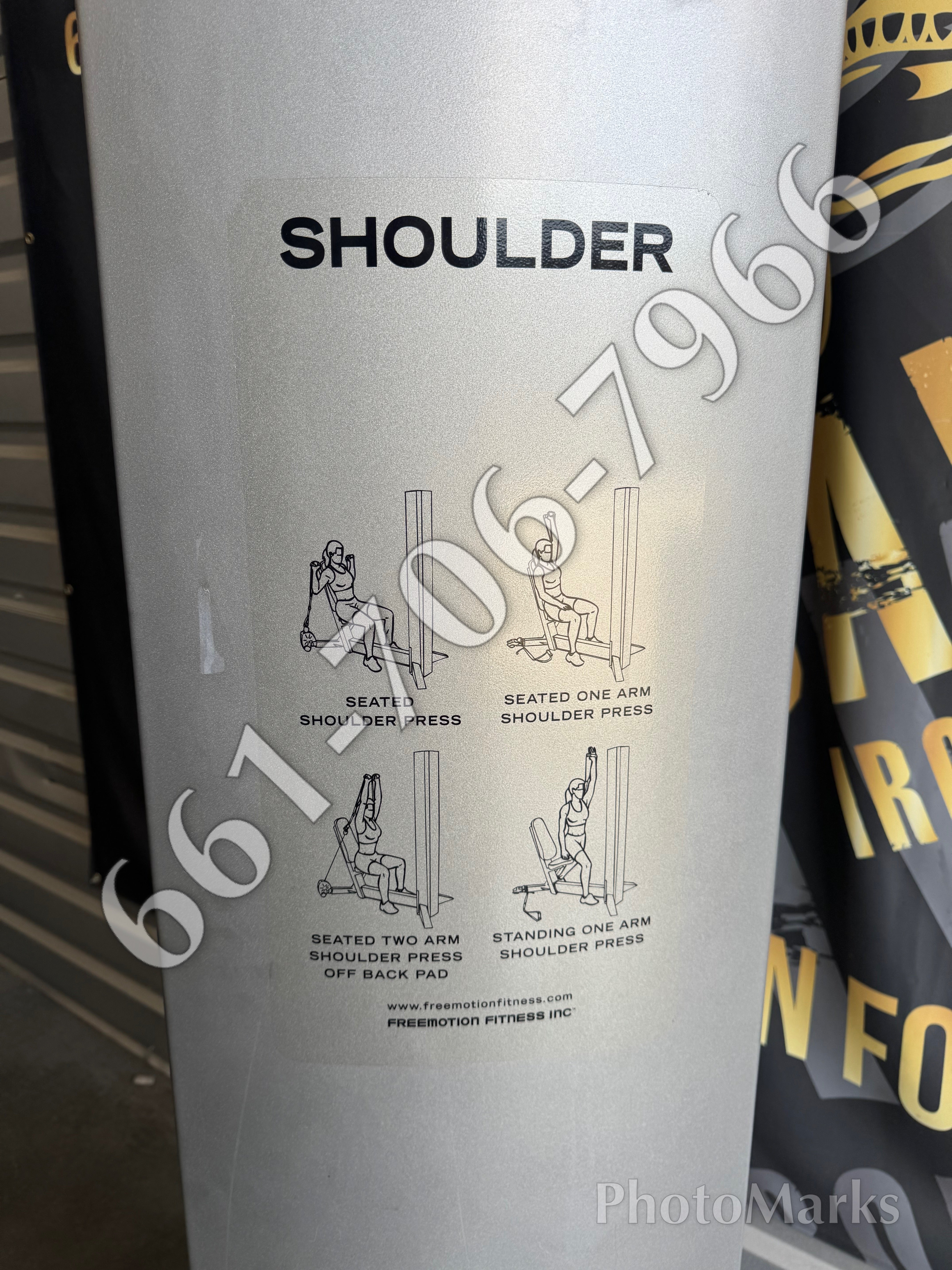 This Free Motion Shoulder machine allows the user to train multiple areas of the shoulders and upper back. Seated Shoulder Press, Seated One Arm Shoulder Press, Seated Two Arm Shoulder Press off Back Pad and Standing One Arm Shoulder Press.