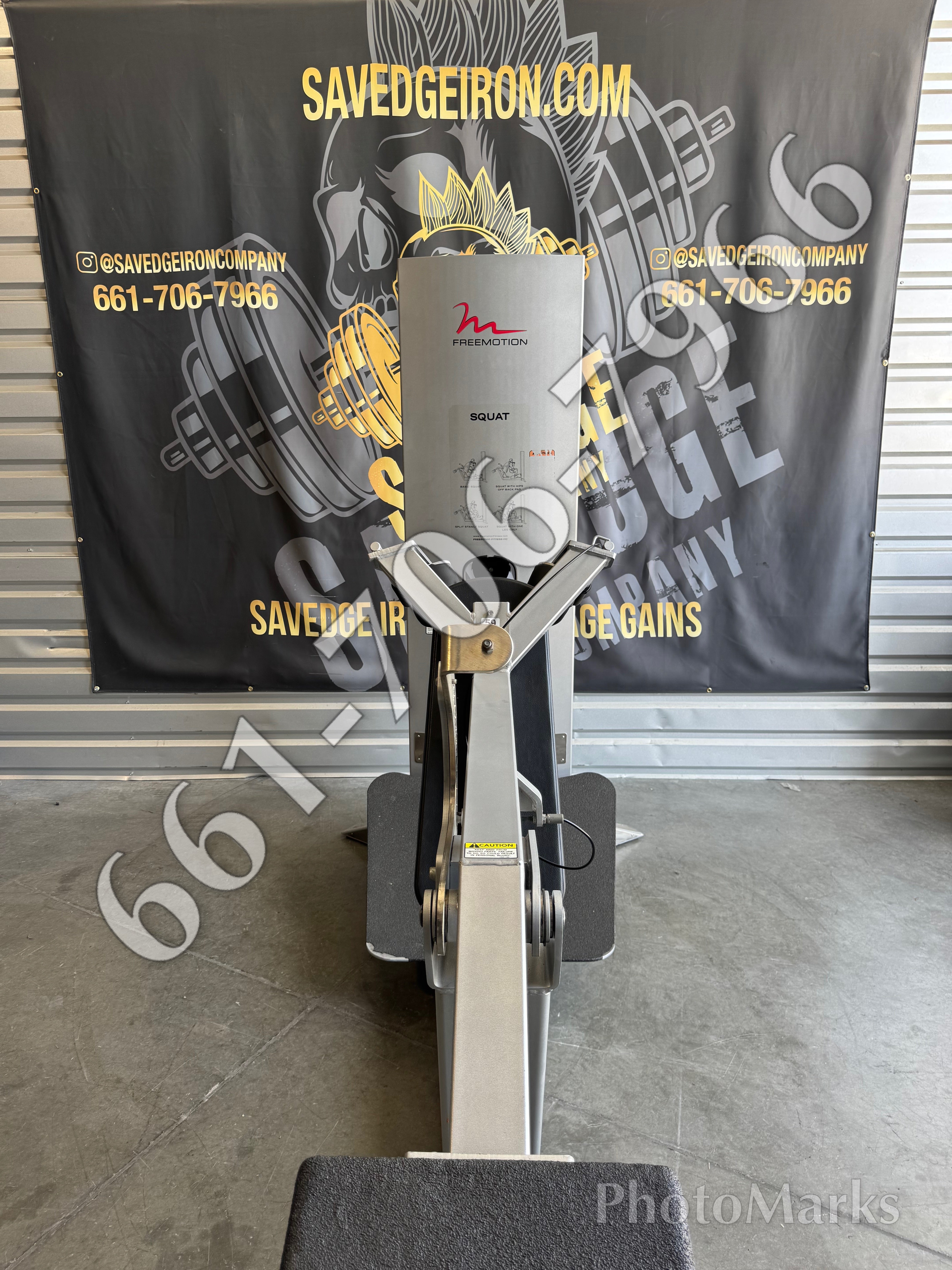 Free motion Squat machine with 400 lb. stack. The angles of the platform on this machine are awesome. The user can squat facing either direction. This piece is very easy on your knees. This is a tank