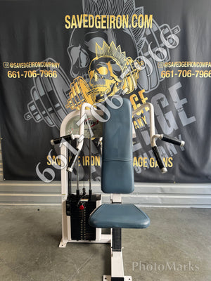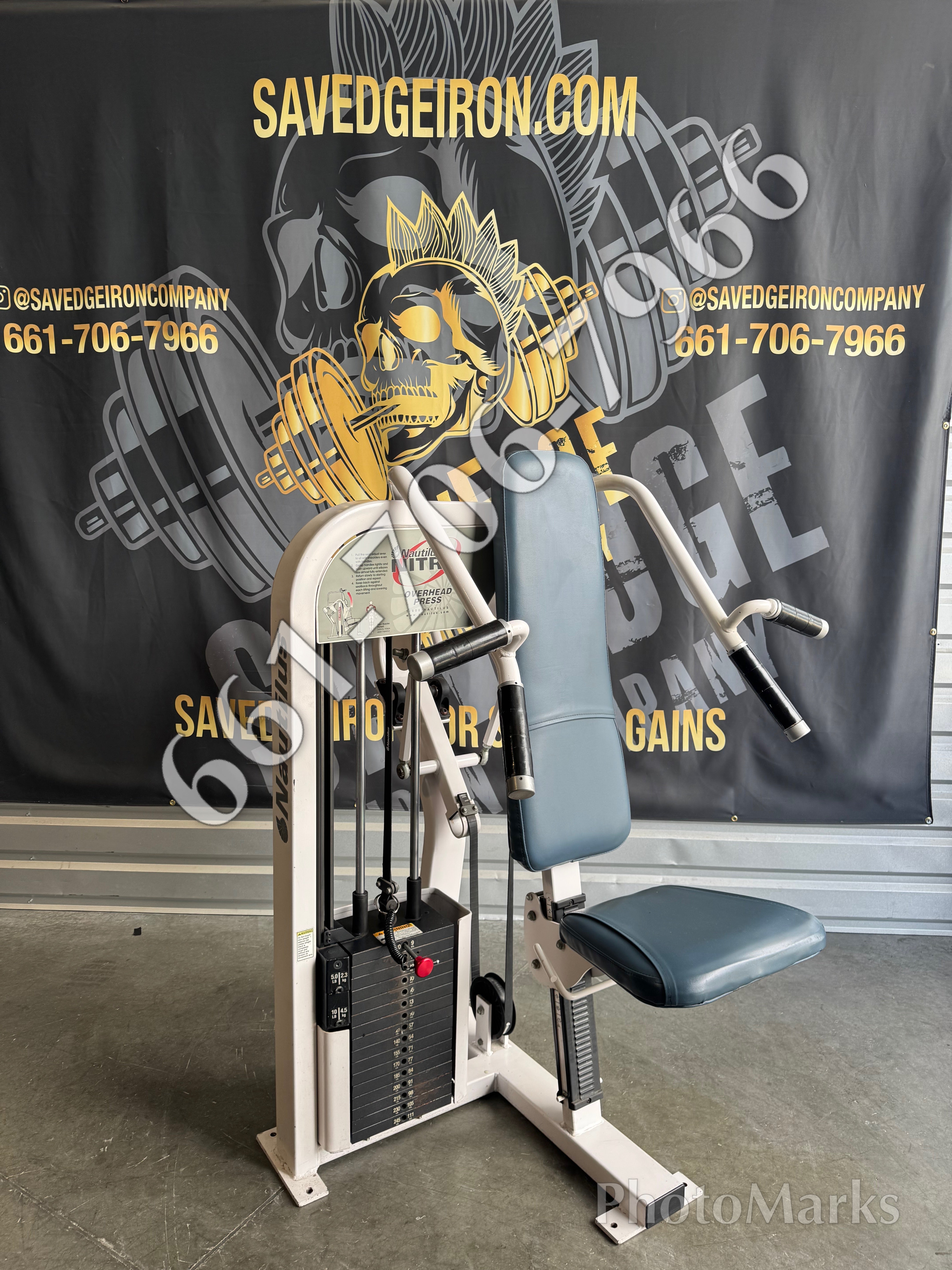 The Nautilus Nitro Overhead Press is a selectorized strength machine that uses Optimal Strength Curve Technology to match a user's strength curve and ensure smooth resistance. It features converging movement arms, a four-bar linkage drive system, and multiple handle positions.