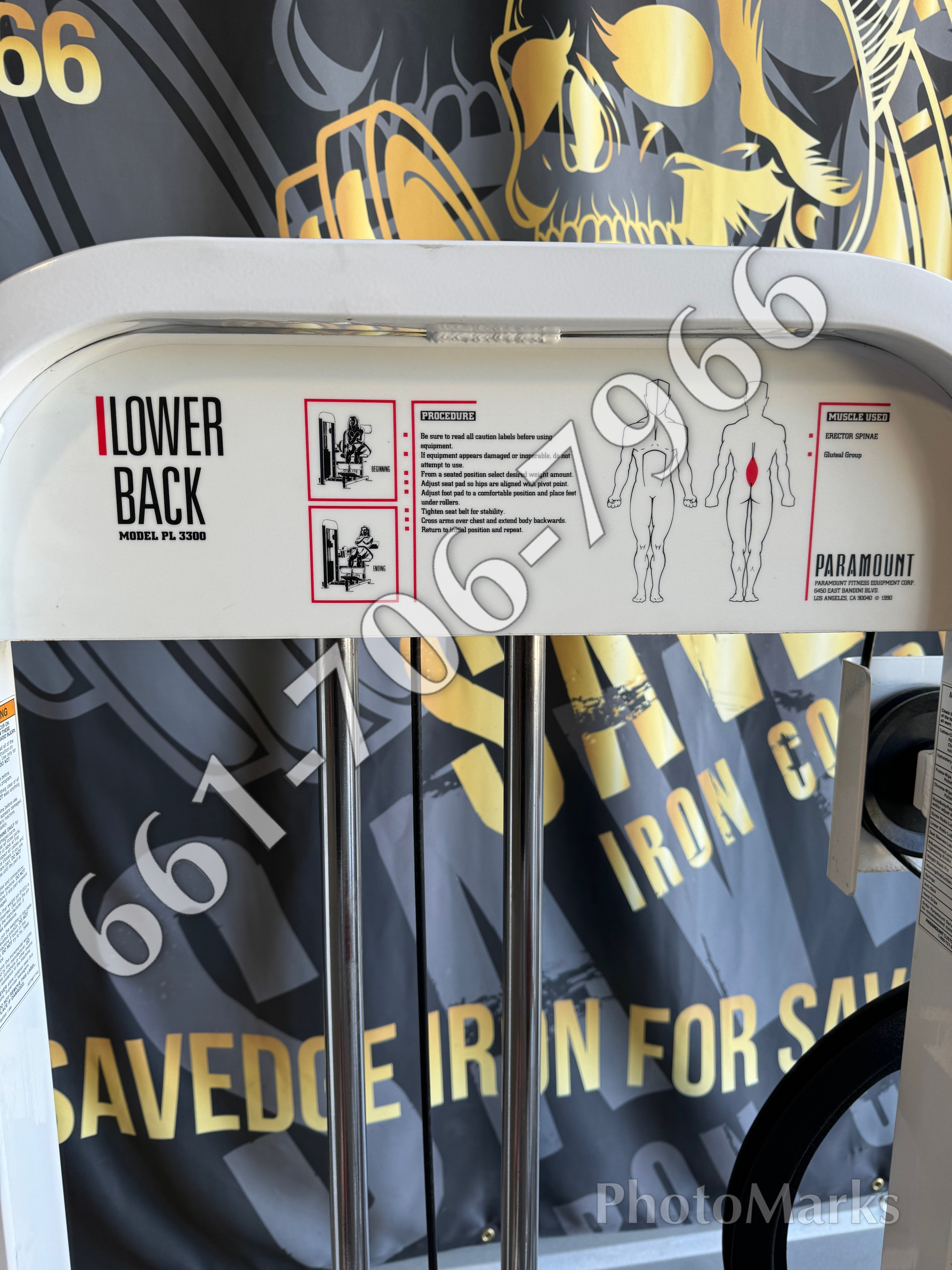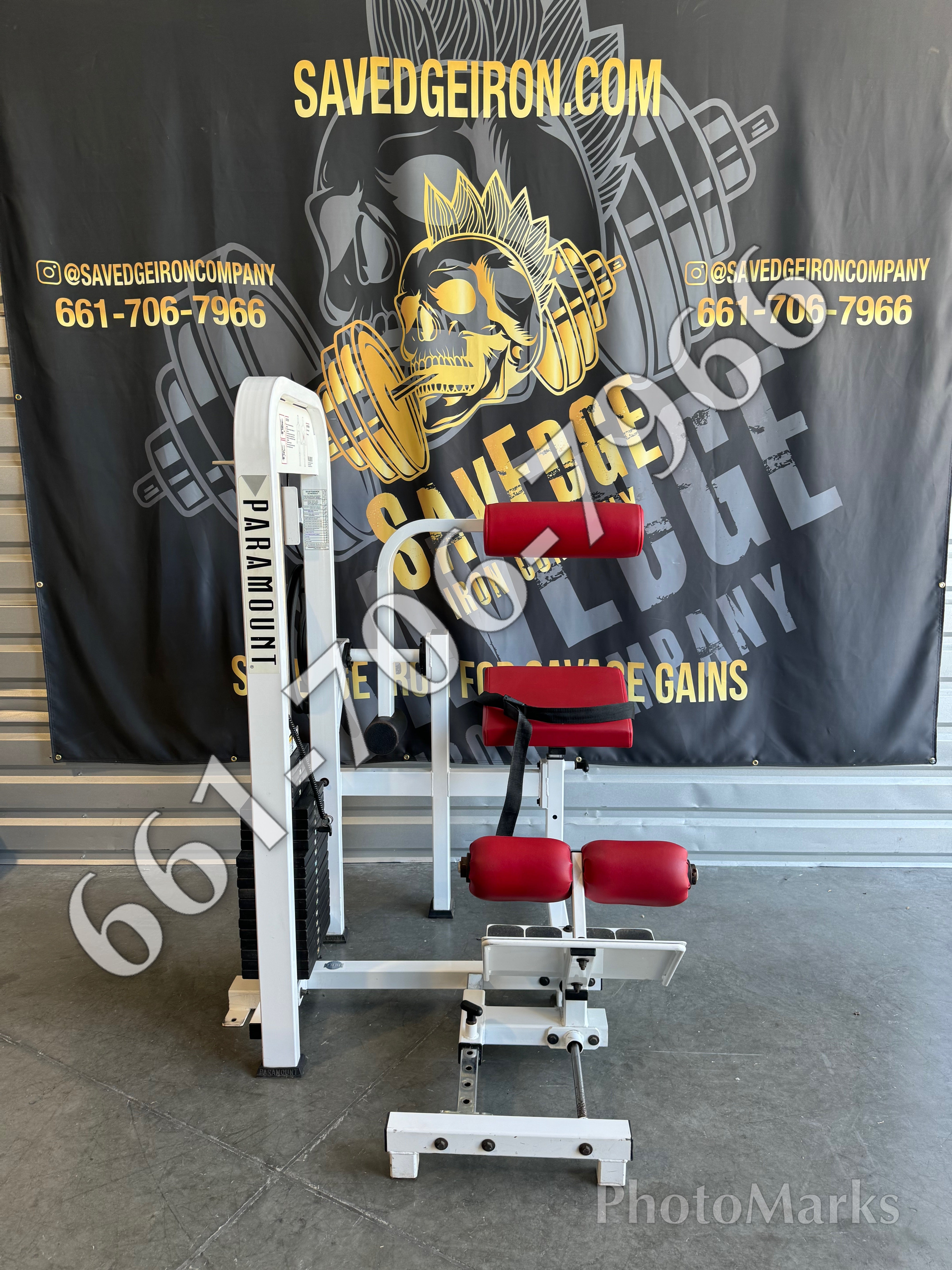 Paramount Lower Back PL3300. This machine is in very good condition. With the adjustable seat and adjustable foot rest any size user will get the perfect angle to target the Lower Back. We have multiple matching Paramount pieces in stock.