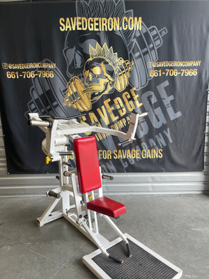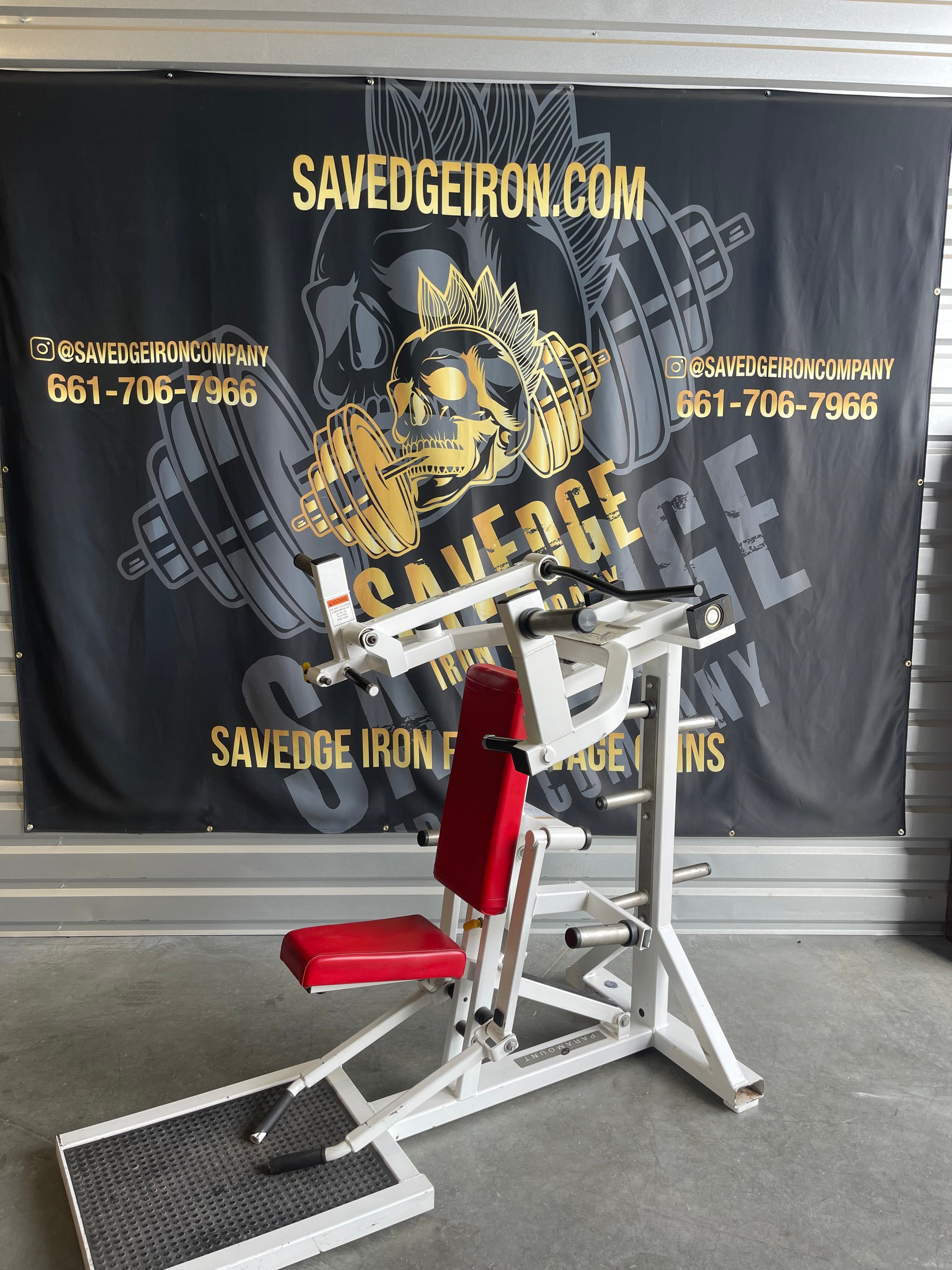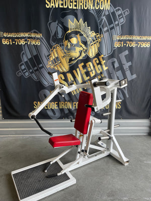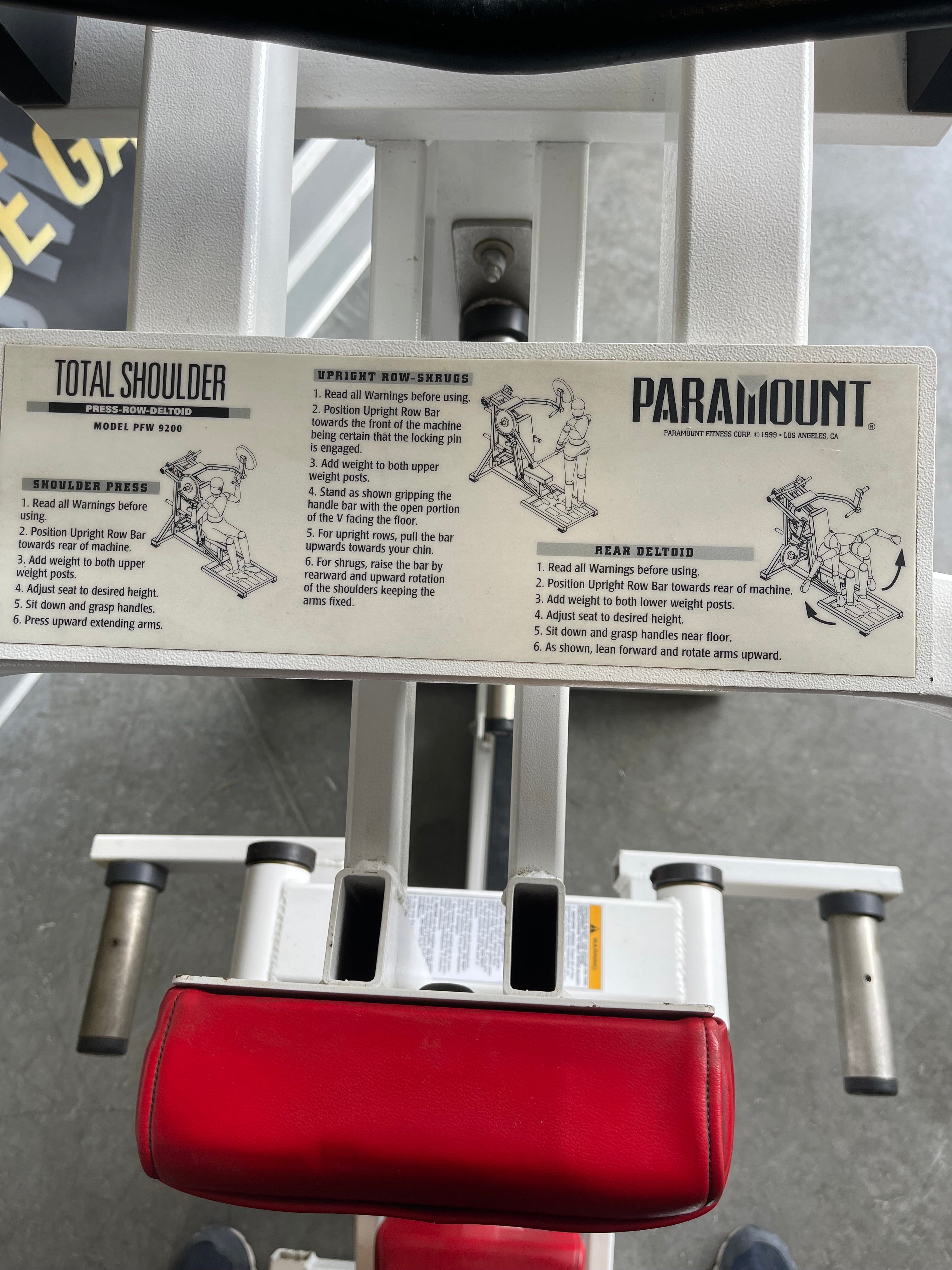Very RARE machine. Paramount Total Shoulder Press-Row-Delt Model PFW 9200. This is an all-in-one Total Shoulder Machine. You can switch from Shoulder Press, Upright Row-Shrugs and Rear Deltoid with a slight adjustment.