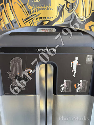 Precor Vitality Bicep Curl. The Vitality Series Biceps Curl features a single seat adjustments for proper positioning and optimal comfort. Users can easily engage the add on weight with a simple push of a lever to increase the work load. The conveniently located instructional placard offers guidance on body position, movement and muscles worked. The start position is easily adjusted while the exerciser is sitting in the unit.